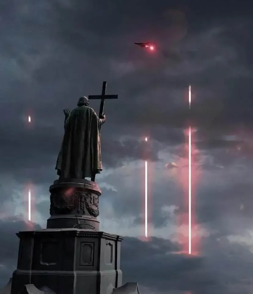 На зображенні — банальна ніч у незламному Києві воєнного літа 2025 року на тлі Хрестителя роботи Вадима Блонського.