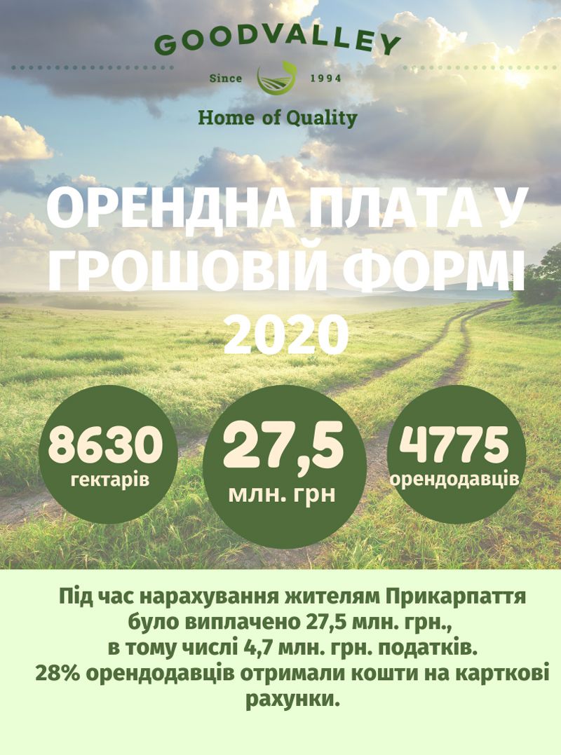 Щороку «Ґудвеллі Україна» є першою агрокомпанією в регіоні, яка розпочинає орендну плату за поточний рік уже на початку весни. А цього року було встановлено рекорд із найшвидшого завершення виплати орендної плати в грошовій формі. Безумовно, ці кошти були хорошою підтримкою для майже 5000 жителів Прикарпаття в цей нелегкий час. Зараз компанія активно працює в полі, сподівається на щедрий урожай і готується до виплати за оренду в натуральній формі, яка проводитиметься восени.