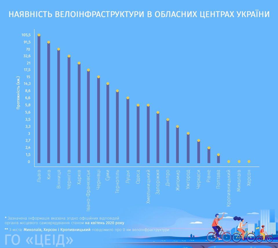 Крім того, аналітик прокоментував дані про наявну велоінфраструктуру міст-обласних центрів України станом на квітень 2020 року.