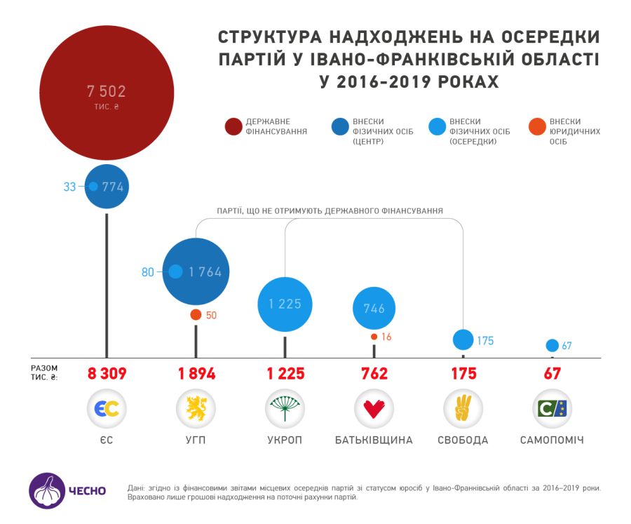 Місцеві парторганізації ЄС існували за кошти державного фінансування. На противагу осередкам “Батьківщини”, які не одержали від центрального офісу жодної копійки, – їхню життєдіяльність забезпечував керівник обласної організації партії. Жертовні працівники профінансували УКРОП на десятки тисяч гривень. Витрати й надходження “Свободи” не відповідають системному піару партії в місті. УГП залежала від внесків кількох юридичних осіб з львівською реєстрацією. “Самопомочі” допомагав центральний офіс, а також родина очільника обласної організації політсили. Новостворена “Платформа громад”, попри публічний старт, приховала своїх спонсорів і видатки.