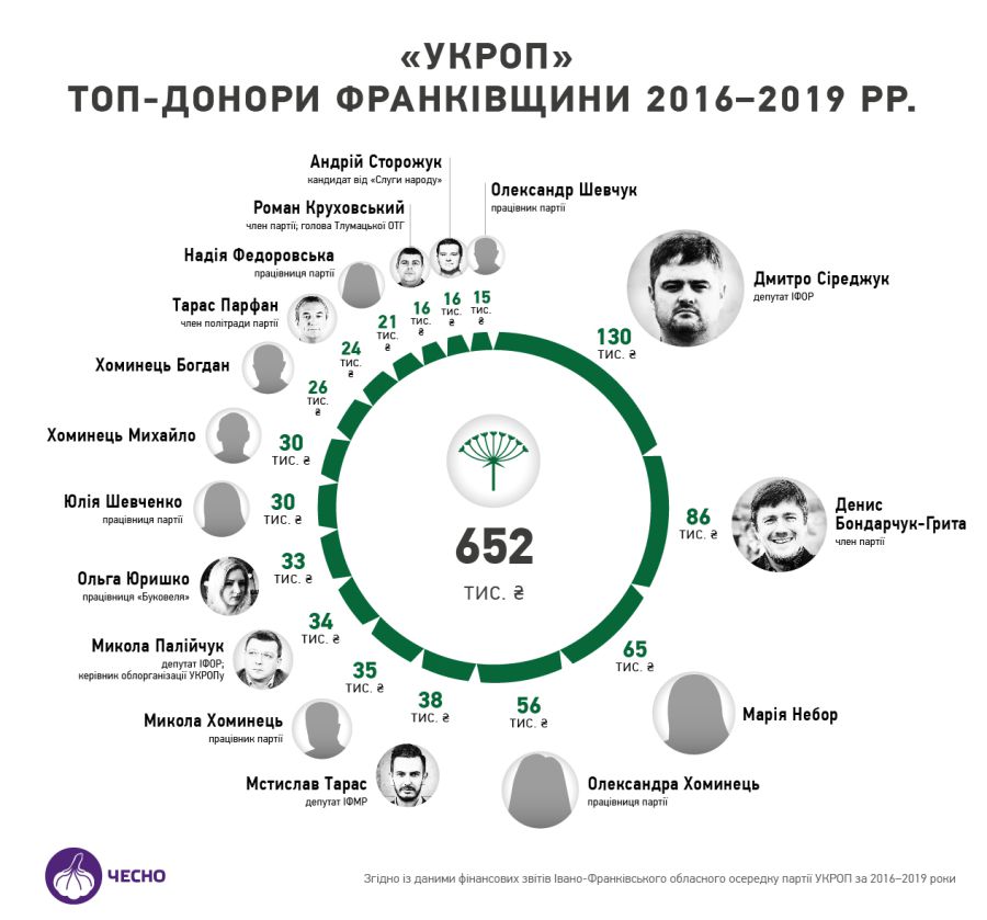 У ТОП-15 спонсорів — член політради партії, ексдепутат Івано-Франківської обласної ради Тарас Парфан (23,6 тис. грн), голова Тлумацької ОТГ Роман Круховський (майже 16 тис. грн) та кандидат на виборах до Верховної Ради 2019 року від “Слуги народу”, на користь якого зняв свою кандидатуру Олександр Шевченко, Андрій Сторожук (15,5 тис. грн).
