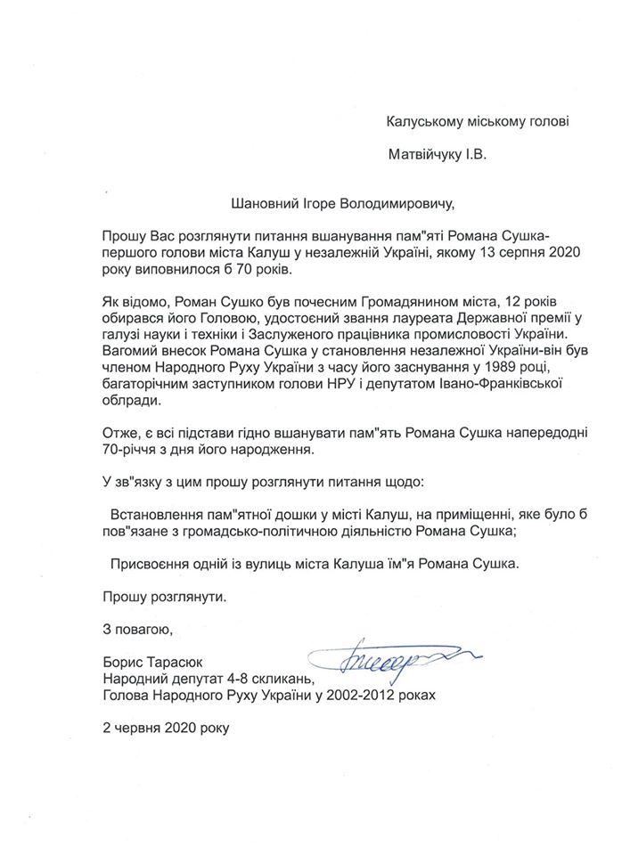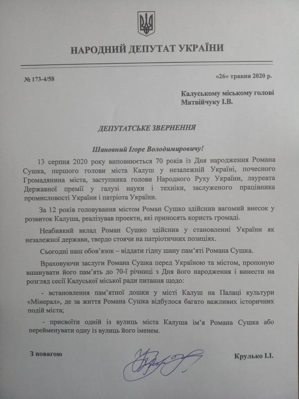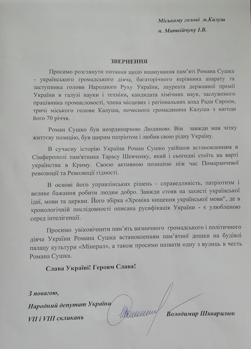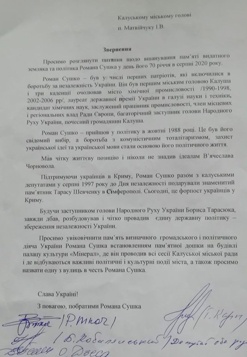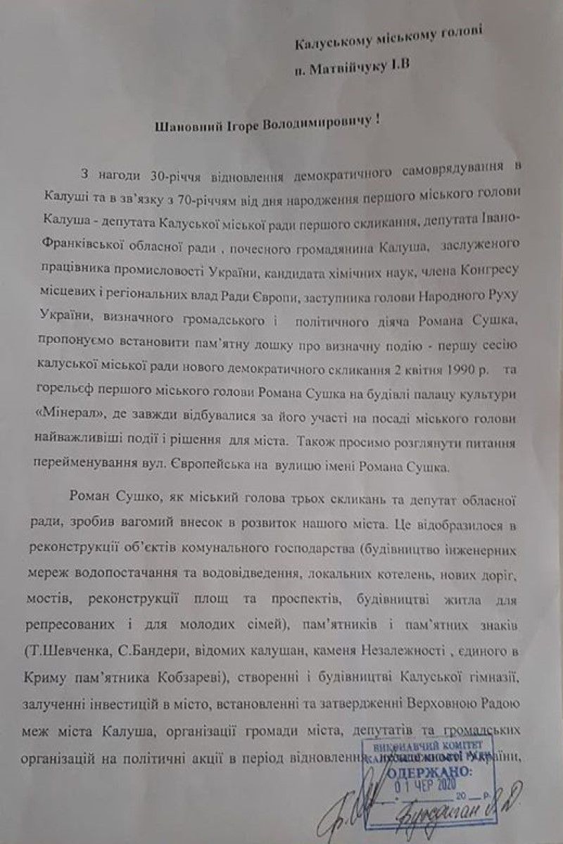 Йдеться про "встановлення меморіальної дошки першому голові міста Калуш у незалежній Україні, почесному Громадянину міста, заступнику голови Народного Руху України Сушку Роману Васильовичу та пам’ятної дошки 30-літтю відновлення демократичного самоврядування в м. Калуш", інформують "Вікна".