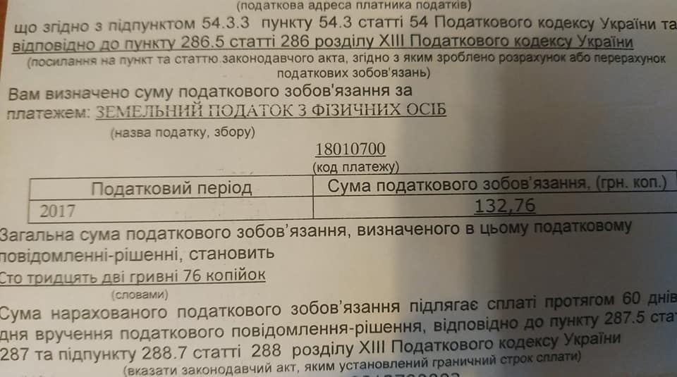 Володимир Шпег показує повідомлення про земельний податок, який днями отримала його мама. Там, де торік у платіжці було 260 гривень, тепер — 4,5 тисячі. За 10 сотих приватизованої землі. Чоловік обурюється: такого різкого стрибка аж ніяк не очікував і тим паче не розуміє, за що має нині платити таку космічну суму, йдеться в сюжеті телеканалу 402.