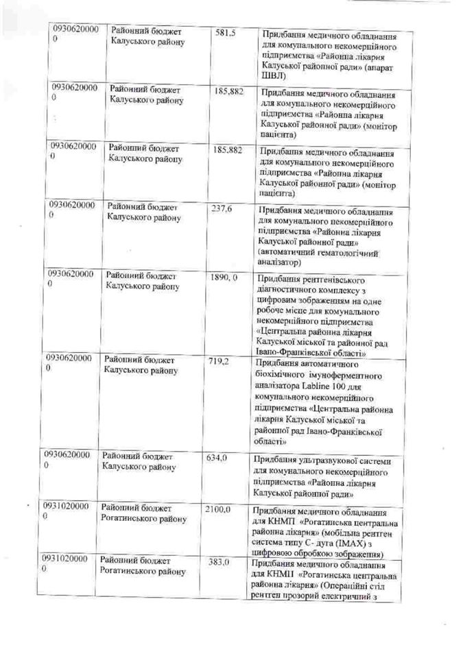 За його словами, для районної лікарні Калуської районної ради придбають апарат ШВЛ, монітори пацієнта, автоматичний гематологічний аналізатор, напівавтоматичний біохімічний аналізатор.