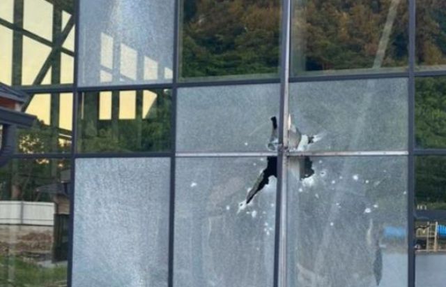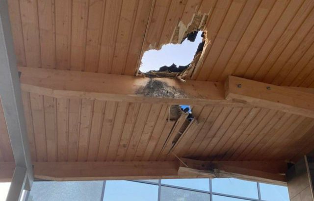 Попередньо пошкоджено 7-9 скляних панелей самої будівлі та альтанки, які стоять біля будівлі, на одній з альтанок на даху застряг снаряд з РПГ, який не розірвався.