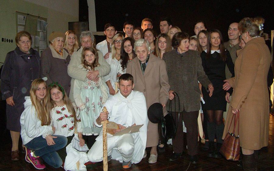 Віра Пілянська з акторами молодіжного театру «ЛюбАрт» на завершенні циклу вистав Калуської філії Союзу українок "Війна — слово нез'ясованого роду". Калуш, Народний дім, жовтень 2013 року