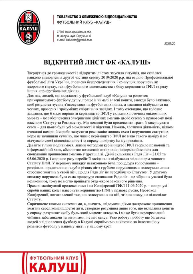 Футбольне керівництво ФК «Калуш» звернулося до громадськості з відкритим листом, в якому відверто критикує методи роботи ПФЛ, якими абсолютно незаконно  створили інформаційне поле для спонукання припинення змагань у Другій лізі.