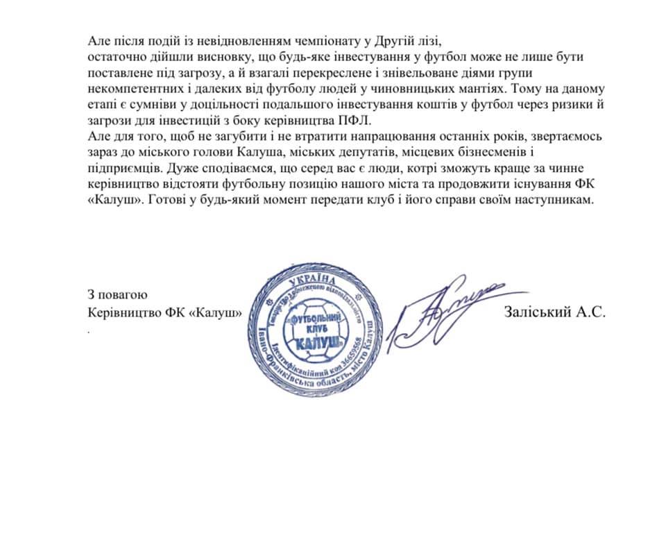 "Звертаємося зараз до міського голови Калуша, міських депутатів, місцевих бізнесменів і підприємців. Дуже сподіваємося, що серед вас є люди, котрі зможуть краще за чинне керівництво відстояти футбольну позицію міста і продовжити існування ФК "Калуш". Готові у будь-який момент передати клуб і його справи наступникам".