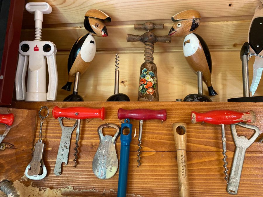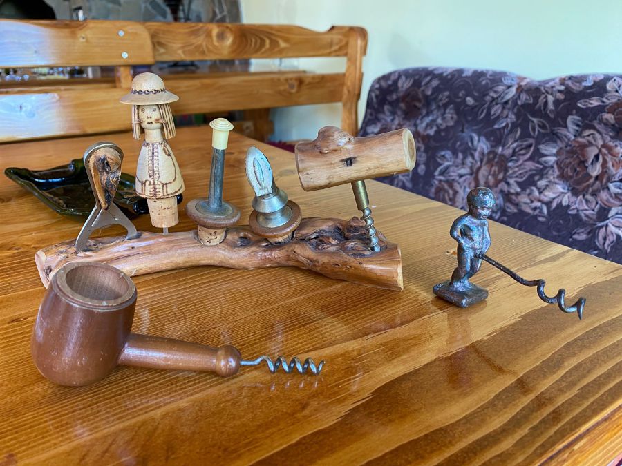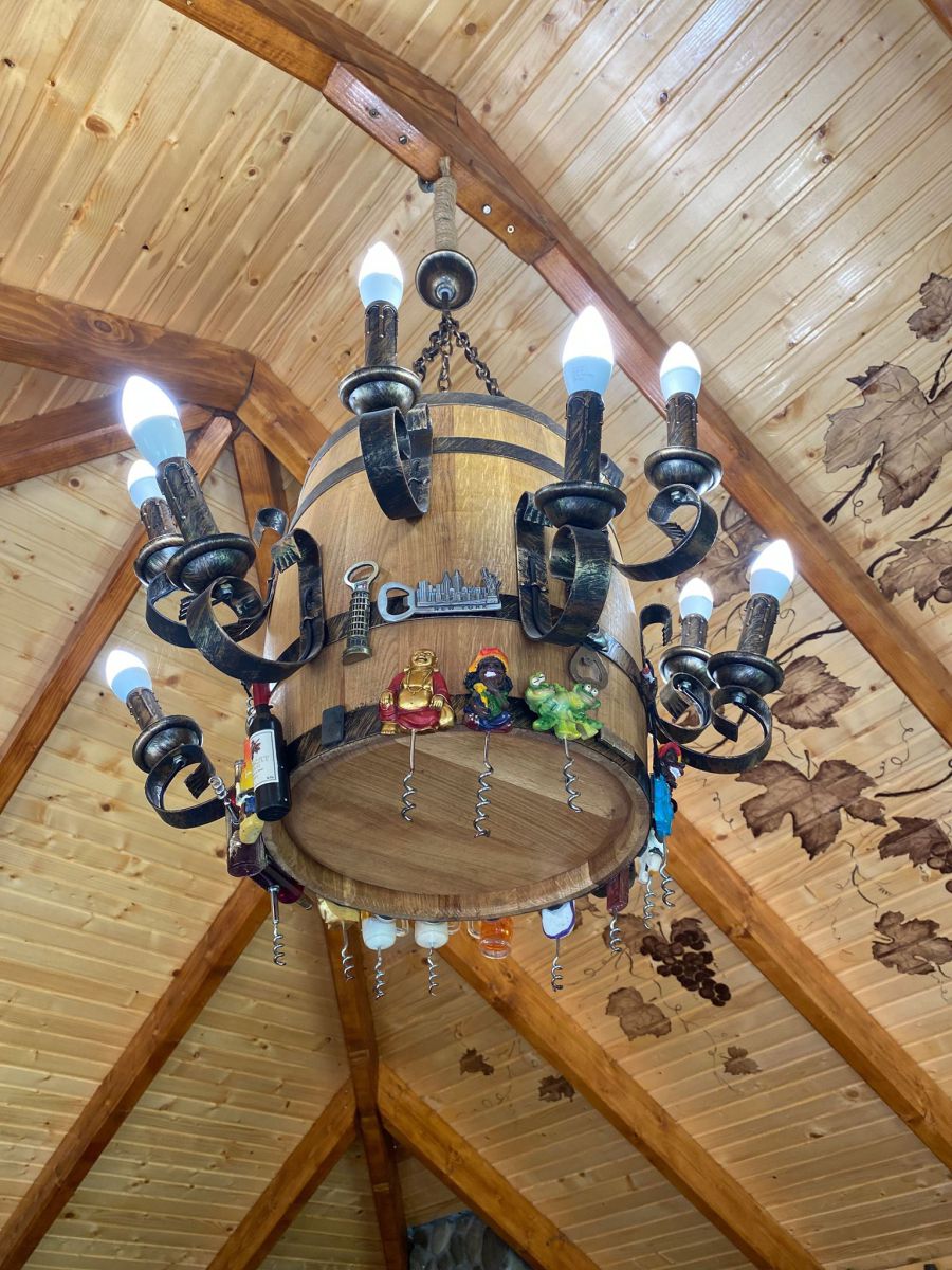 Нині в колекції – приблизно 600 штопорів. У вигляді тварин, птахів, ключів, зброї, келихів. Різного розміру та кольору. Вони повсюди у просторій альтанці. На стінах, каміні, навіть на люстрі. Вона до речі, зроблена у вигляді бочки. Тут усе про вино — картини, малюнки, глечики, келихи.