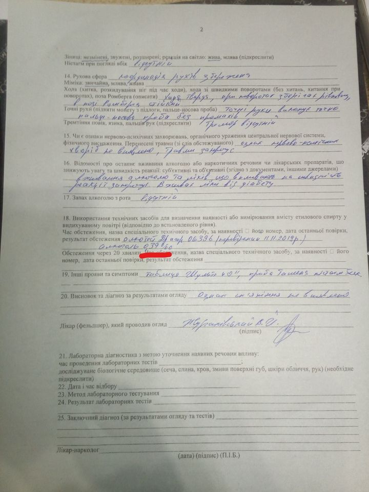 Найбільшою несподіванкою було те, коли всі присутні побачили висновок лікаря-нарколога, що в громадянина ознак сп’яніння не виявлено. Хоча у акті обстеження наркологічного центру чітко зазначили: результати драгера 0,39% проміле. Аналізу крові в звинуваченого не взяли, а тільки аналіз сечі, результат якого буде через три дні.