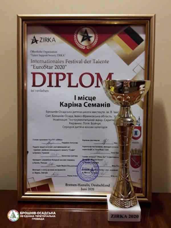Юна скрипачка гідно представила Брошнів-Осадську ОТГ на Internationaled Festival der Talente “EuroStar 2020” (м. Бремен, Німеччина), де здобула перше місце у номінації «Інструментальний жанр», інформують "Вікна" з посиланням на сайт "Місто".
