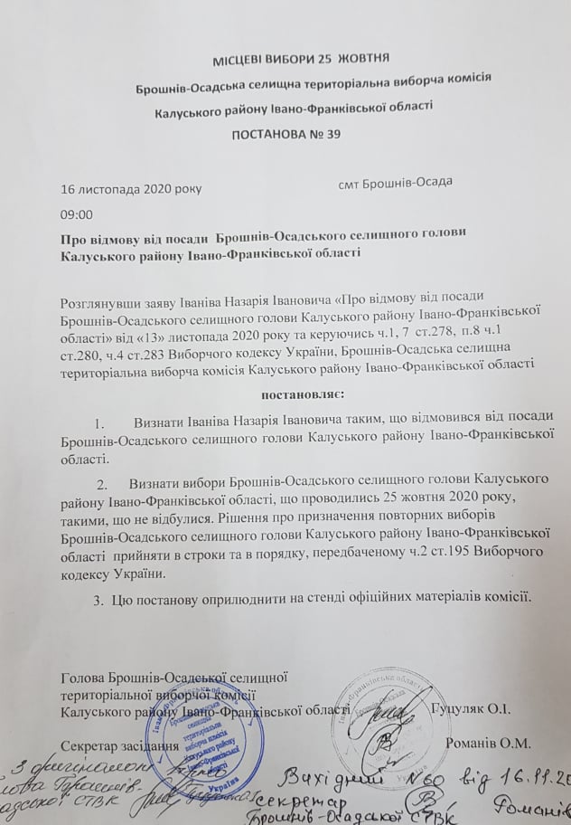 16 листопада Брошнів-Осадська територіальна виборча комісія розглянула заяву Назарія Іваніва про відмову від посади голови і визнала його таким, що відмовився від посади Брошнів-Осадського селищного голови, інформують "Вікна" з посиланням сайт "Курс".