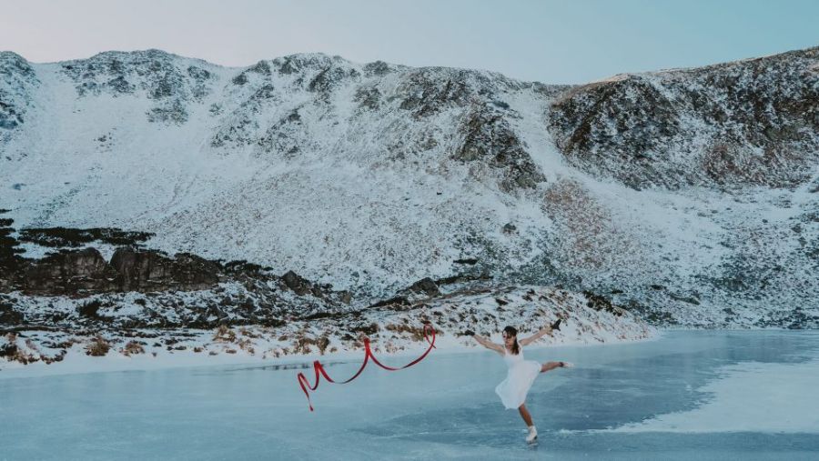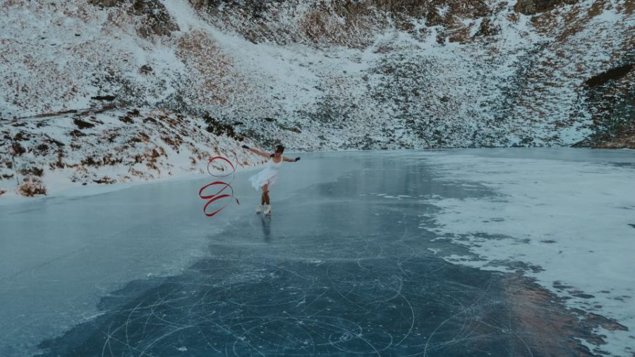 Кілька років тому в Олі виникла ідея покататися на замерзлому гірському озері. Дівчина часто ходить в гори, навіть одна. І ось виник задум поєднати два захоплення — гори і ковзани. Відтак ця пристрасть втілилася на світлинах — тендітна дівчина у білій сукні, на ковзанах, на крижаному озері в обіймах гір, а червона стрічка для художньої гімнастики підсилює динаміку, створює акцент, контраст.