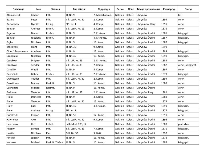 Пропонуємо список жителів Угринова (нині — Середній Угринів та Старий Угринів) в Першій світовій війні: