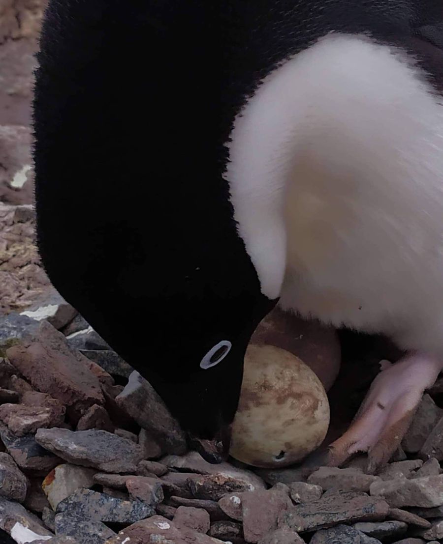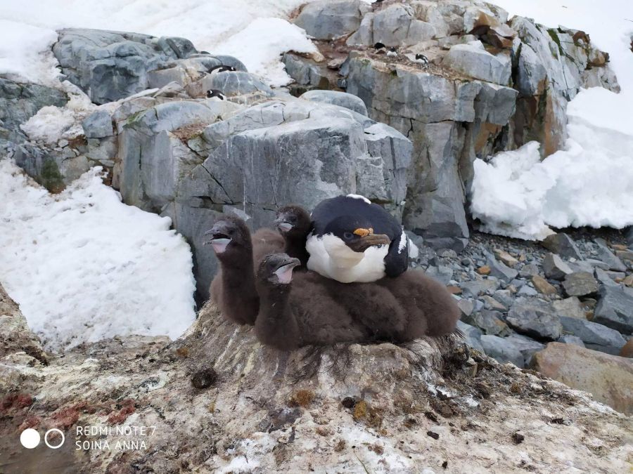 Так, уже мають дитинчат синьоокі антарктичні баклани. Пригадуєте, ми розповідали, що їх легко впізнати за синім кільцем шкіри навколо темних очей та помаранчевими наростами над клювом?