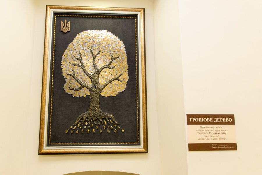Художник зібрав на оглядовому майданчику Ратуші та вистелив на полотні у формі дерева близько 15 кілограмів монет з 15-ти країн світу, інформують "Вікна".