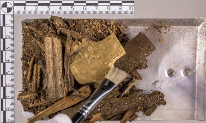 Вчені витягнули з порожнини залишки старого ящика. Він був прикрашений золотом і сріблом. На кришці скриньки була масивна золота пластина з хрестом і буквами "IR".