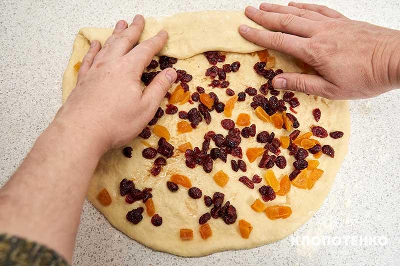 Наріжте невеликими кубиками 125 г кураги і змішайте зі 125 г в'яленої журавлини. Залийте 50 г рому і залиште настоюватися на 2-3 години, а якщо є можливість — на ніч. Обімніть тісто і руками розподіліть його в круглий пласт товщиною 1 см на припорошеній борошном поверхні.