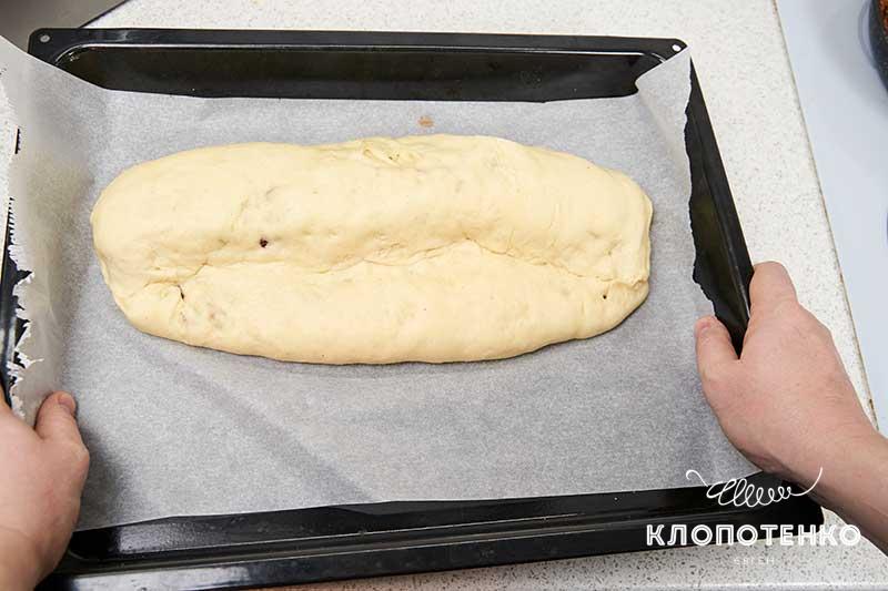Складіть тісто ще раз до тонкого краю. Злегка примніть в районі шва. Залиште сформований штолен ще на 20-30 хвилин.