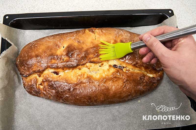 Дістаньте штолен з духовки і змастіть 25 г гарячого топленого масла.