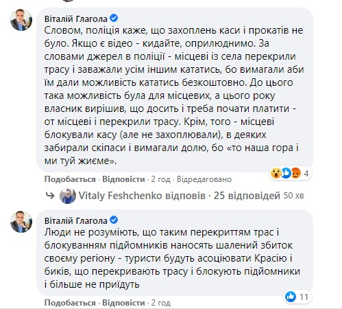 «Місцеві із села перекрили трасу і заважали усім іншим кататись, бо вимагали аби їм дали можливість кататись безкоштовно. До цього така можливість була для місцевих, а цього року власник вирішив, що досить і треба почати платити — от місцеві й перекрили трасу. Крім, того — місцеві блокували касу (але не захоплювали), в деяких забирали скіпаси й вимагали долю, бо «то наша гора і ми туй жиєме», — пише журналіст Віталій Глагола у коментарях під дописом Шекети.