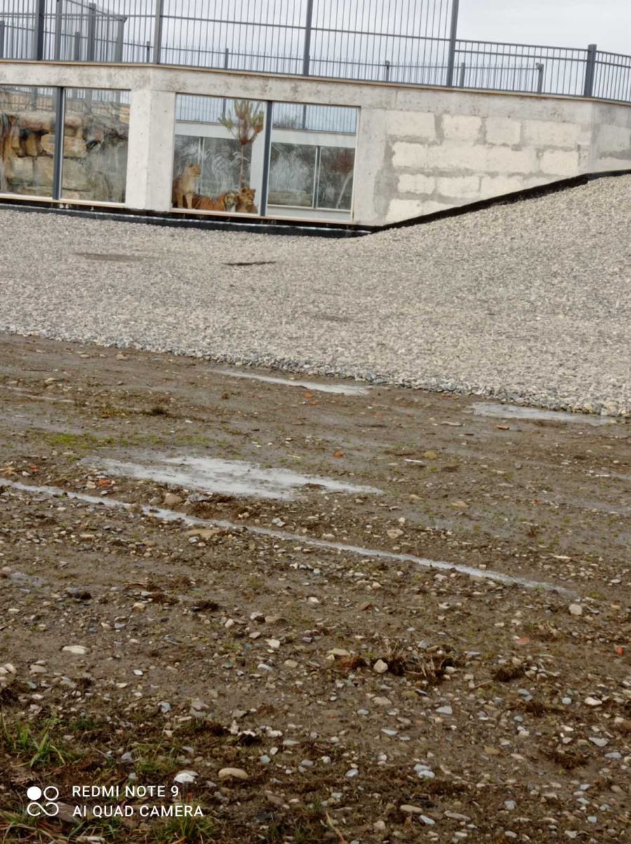 Два леви і тигр живуть у вже збудованому сучасному вольєрі, безтурботно граються і охоче позують для фотосесії цікавих відвідувачів із-за огорожі.