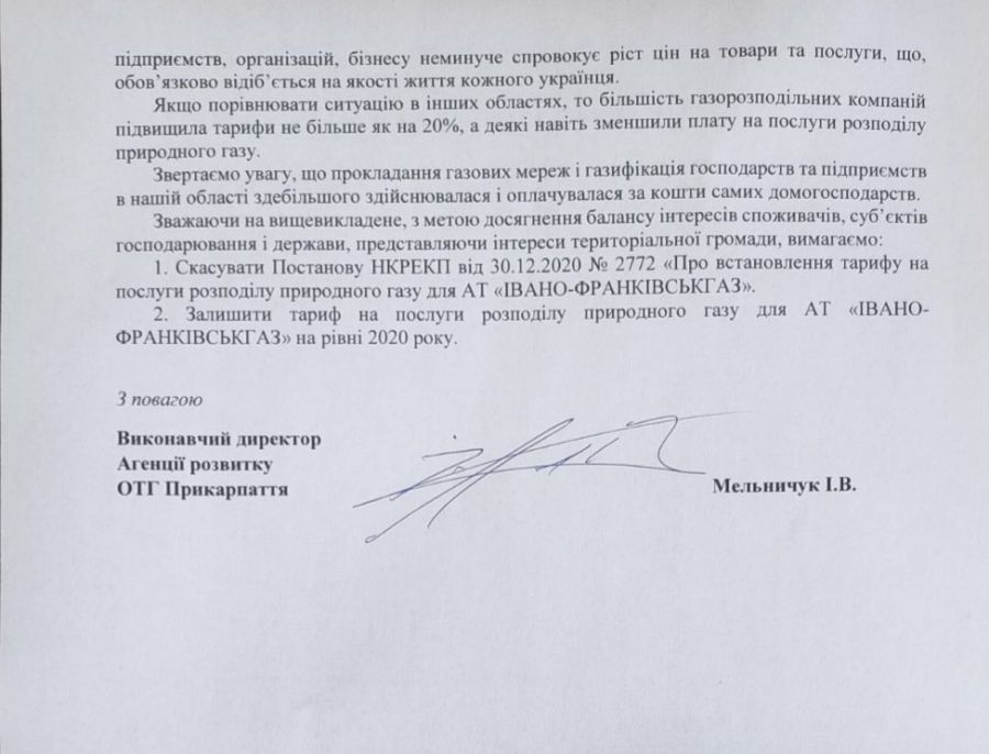 "Збільшення тарифу на послуги розподілу природного газу посилює фінансове навантаження на місцеві бюджети територіальних громад, підприємства різної форми власності, представників малого й середнього бізнесу та особливо побутових споживачів природного газу", — йдеться у листі.
