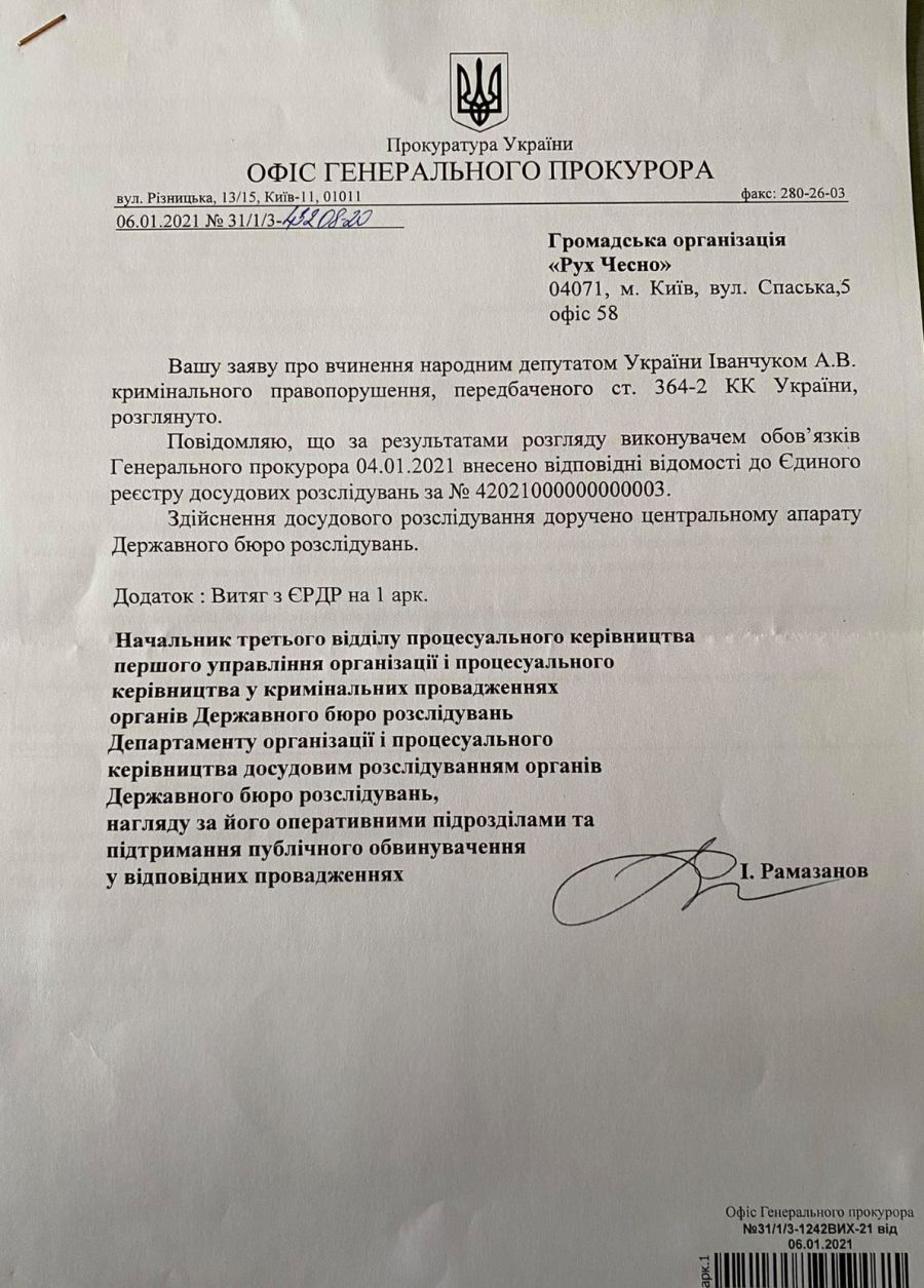 Рух ЧЕСНО отримав від ОГП листа про те, що перший заступник генпрокурора Роман Говда за заявою вніс до Єдиного реєстру досудових розслідувань відомості про ймовірне вчинення Іванчуком кримінального правопорушення за ст. 364-2 Кримінального кодексу України (здійснення народним депутатом на пленарному засіданні Верховної Ради голосування замість іншого народного депутата), інформують "Вікна" з посиланням на сайт "Чесно".