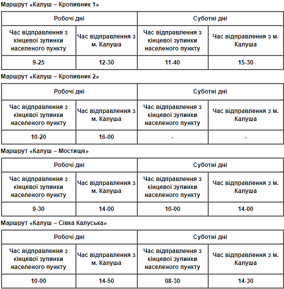 На сайті Калуської міської ради оприлюднено графік руху приміського автотранспорту загального користування Калуської міської територіальної громади, згідно з яким буде здійснюватися безкоштовне перевезення пільгових категорій громадян, пенсіонерів за віком та осіб з інвалідністю: