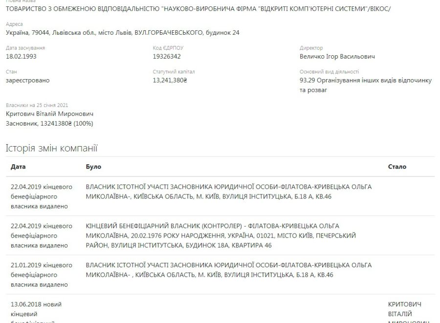 За даними ЄДРПОУ, кінцевим бенефіціаром вказаний житель Львова Критович Віталій Миронович. Його внесок до статутного фонду становить 13,24 млн. гривень. У жовтні особа з такими персональними даними шукала роботу водія із зарплатою 17 тис. гривень.