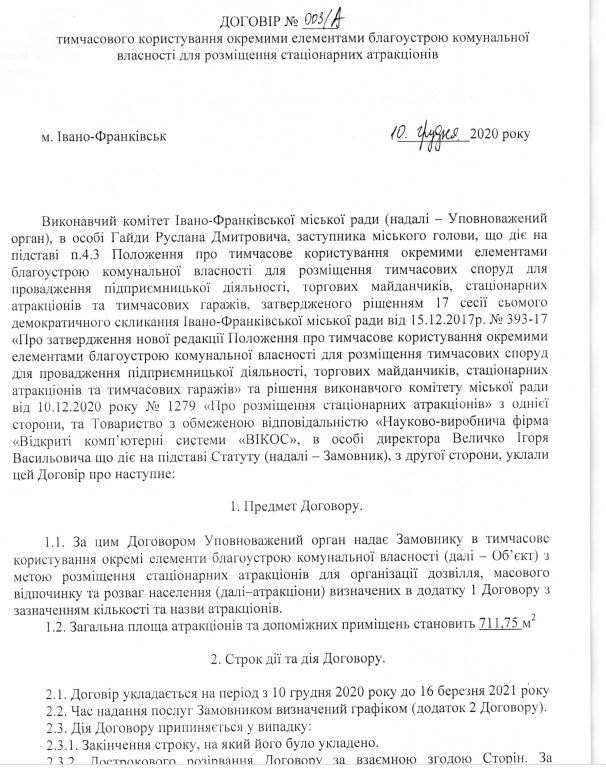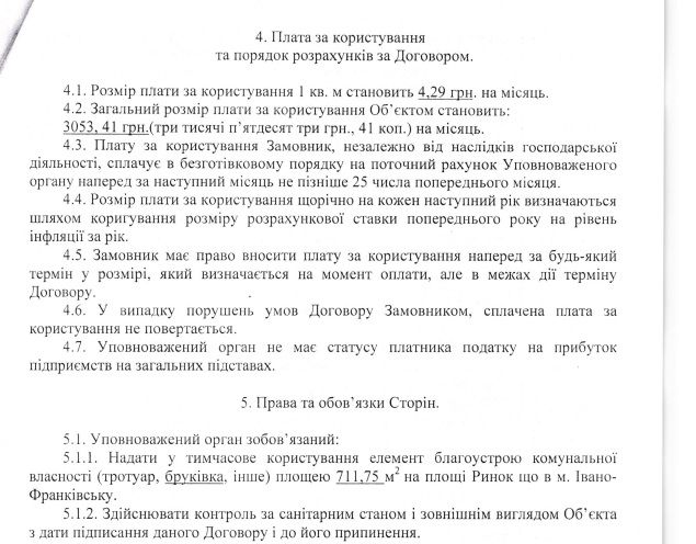 У грудні міськвиконком уклав договір тимчасового користування окремими елементами благоустрою з ТОВ «Науково-виробнича фірма «Відкриті комп’ютерні системи Вікос». Згідно з документом, фірма орендувала у міста 712 кв. метрів площі перед ратушею за 4,29 грн. за квадратний метр на місяць або 3054 гривні.