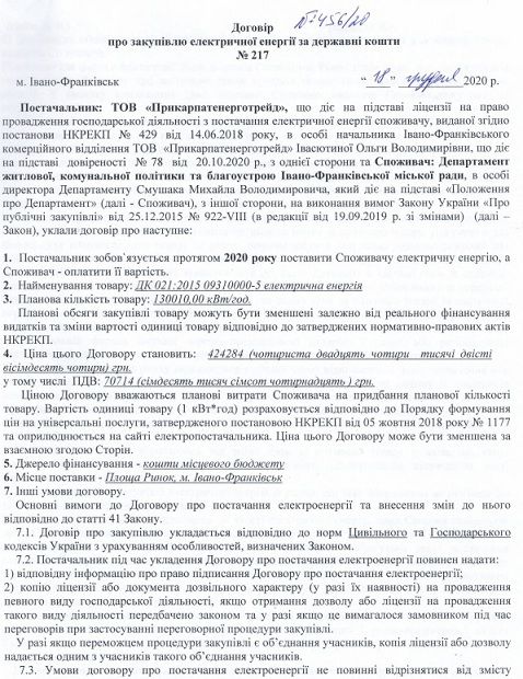 18 грудня 2020 року замовник підписав договір з «Прикарпатенерготрейдом» на поставку 130 тисяч кіловатгодин електроенергії за адресою площа Ринок у центрі Івано-Франківська. Вартість електроенергії становить 424 тис. гривень. Згідно з договором, виконавець мав поставити електроенергію до кінця 2020 року, інформують "Вікна" з посиланням на сайт "Галичина".