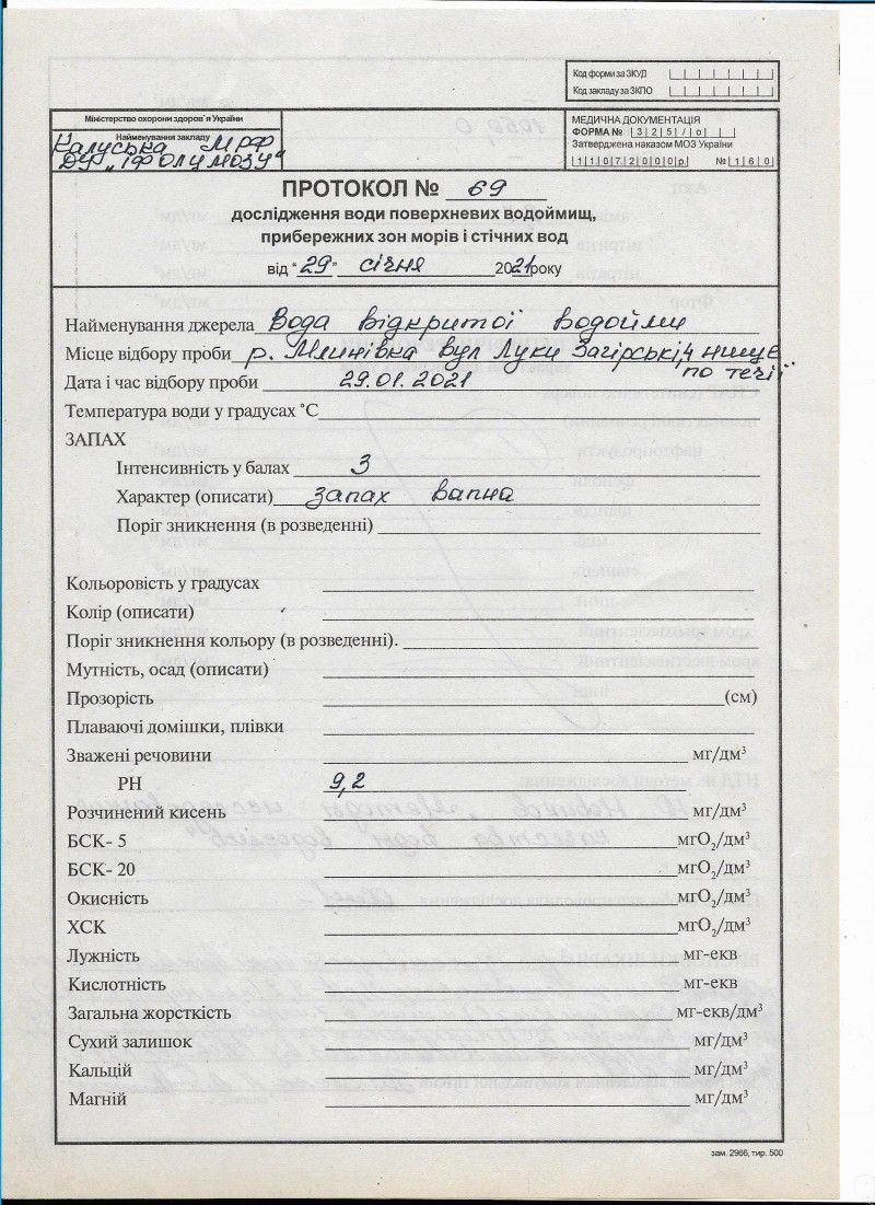 Калуська міськрайонною філія ДУ «Івано-Франківський обласний лабораторний центр МОЗу» надала протоколи досліджень води та висновки щодо якості води. Вода має запах вапна та містить хлориди та аміак.
