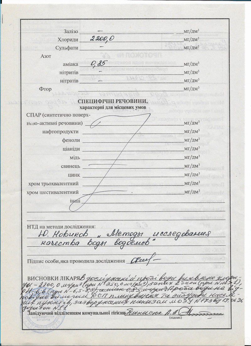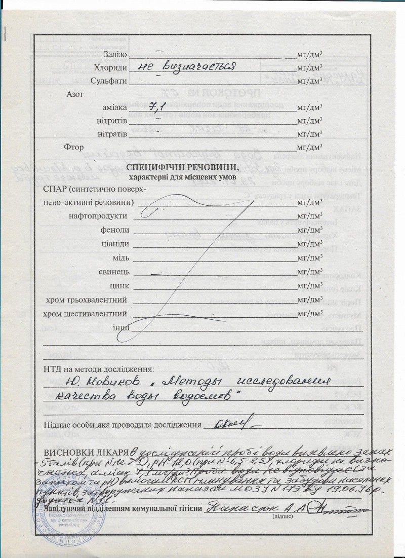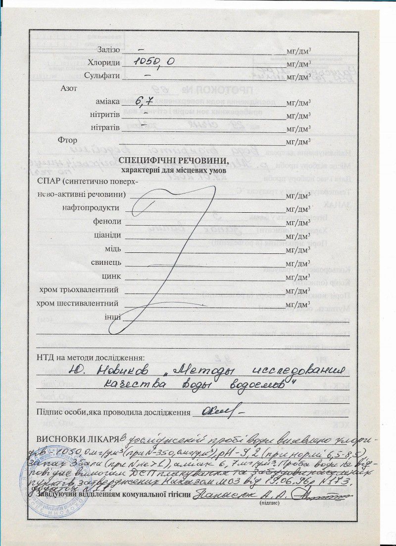 Жодна з досліджуваних проб не відповідає вимогам ДСП планування та забудови населених пунктів, затверджених наказом МОЗ України №173 від 19.06.96 року, додаток №11.
