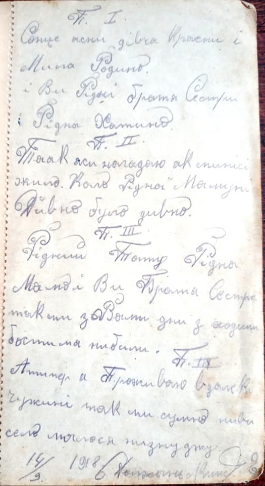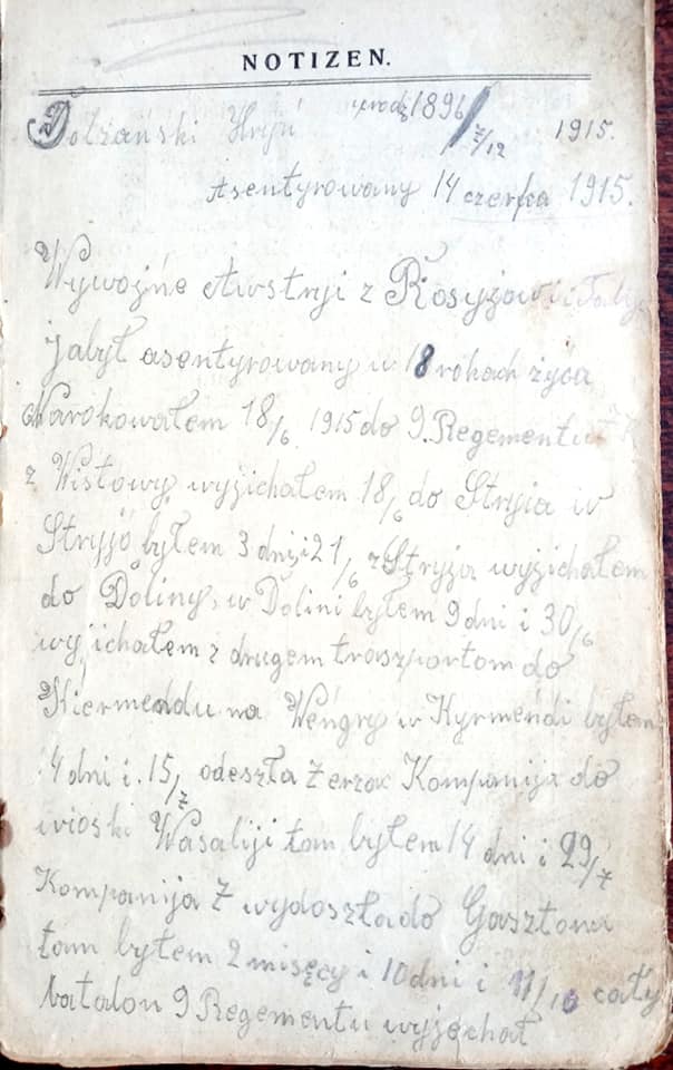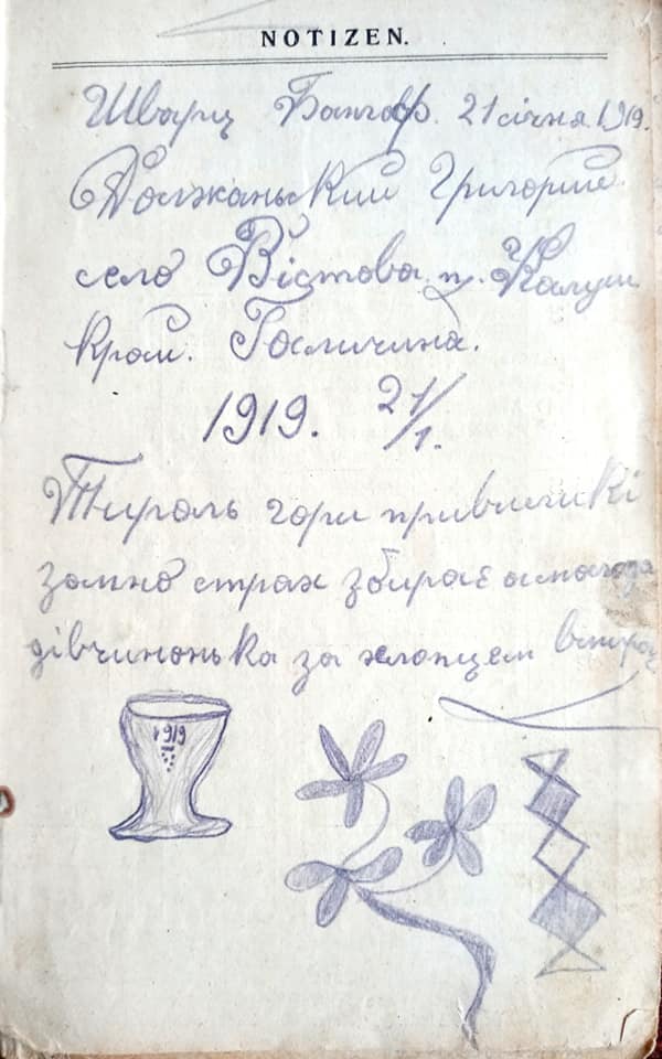 "Хочу запропонувати вам для розгляду записник мого діда — Григорія Довжанського, з яким він пройшов першу світову війну. Дід був поранений, потрапив у полон в Італії, і звідти, кажуть, пішки, вернувся в рідну Вістову", — йдеться в дописі.