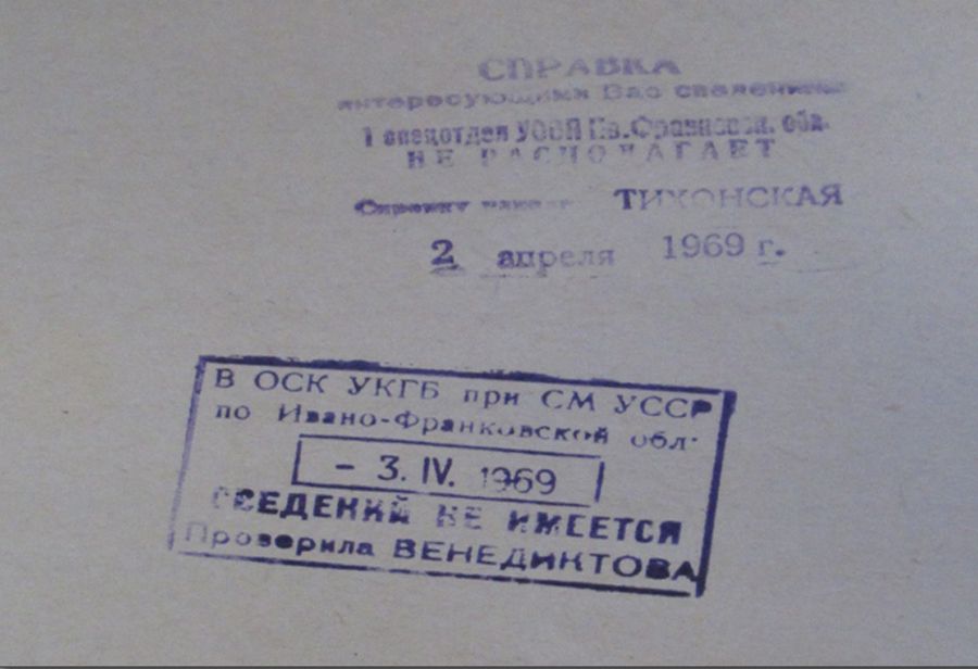 Підтвердженням цього є довідка з відповідним грифом за 1969-ий рік про те, що інформація по даній справі відсутня. Про це вже йшлося у публікації «Вікон» під назвою «Арештовані і розстріляні. Невідомі сторінки ОУН на Калущині».