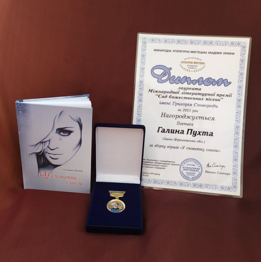 Вона стала переможцем міжнародної літературної премії "Сад божественних пісень" імені Григорія Сковороди за збірку віршів "У сповитку сльози".