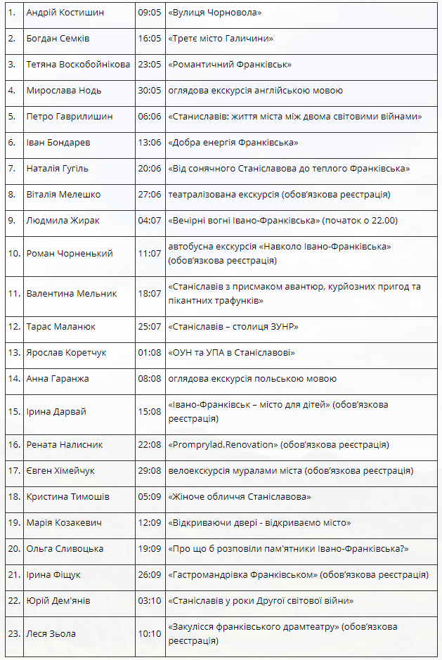 Заплановано провести 23 тематичні та оглядові екскурсії, у тому числі велосипедну, автобусну, театралізовану, дитячу і вечірню.