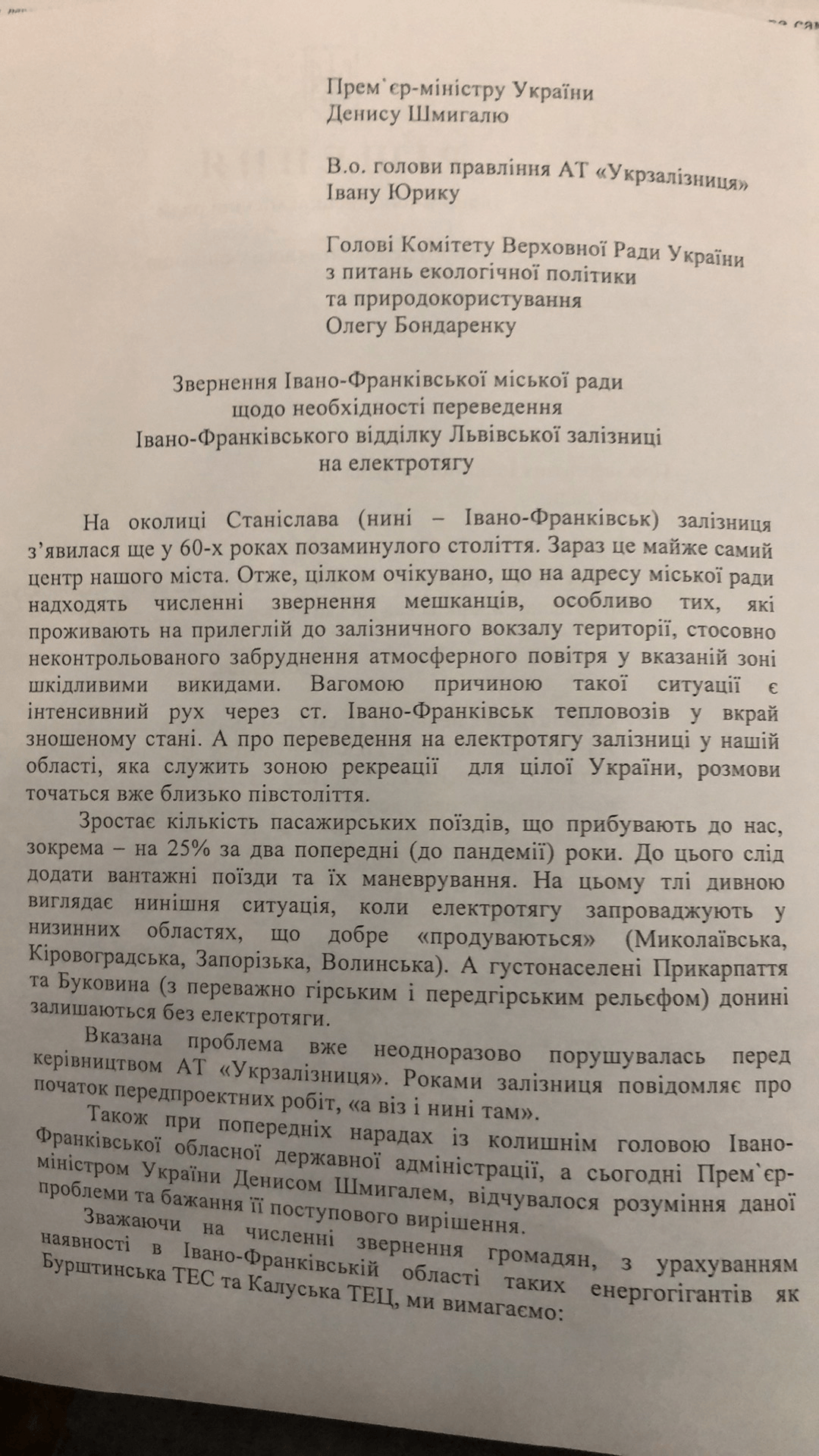 У документі йдеться, що колія проходить центром Івано-Франківська, тут же і вокзал. Викиди із застарілих тепловозів забруднюють місто і шкодять здоров’ю громадян. Оскільки Прикарпаття є рекреаційною зоною, до того ж сюди росте кількість залізничних маршрутів, тут нарешті варто електрофікувати колію. До того ж в регіоні є потужні електрогенератори — Бурштинська ТЕС та Калуська ТЕЦ.
