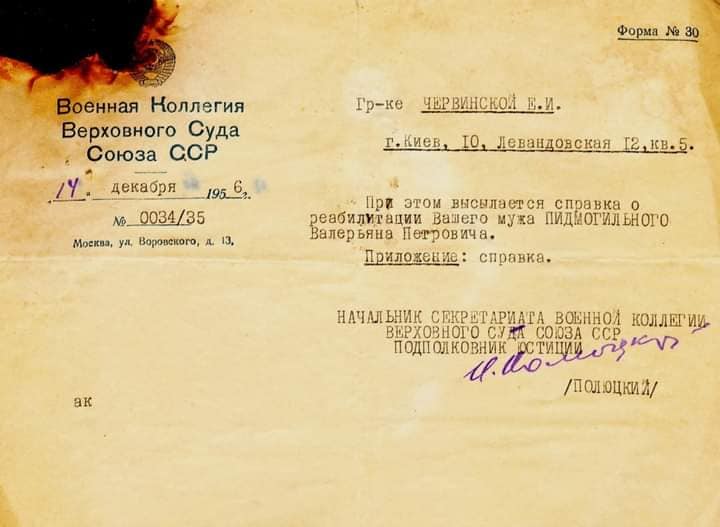 Пізніше рідні письменника отримали документ, що Валер'яна Підмогильного реабілітовано, а справу закрито «за відсутністю складу злочину».