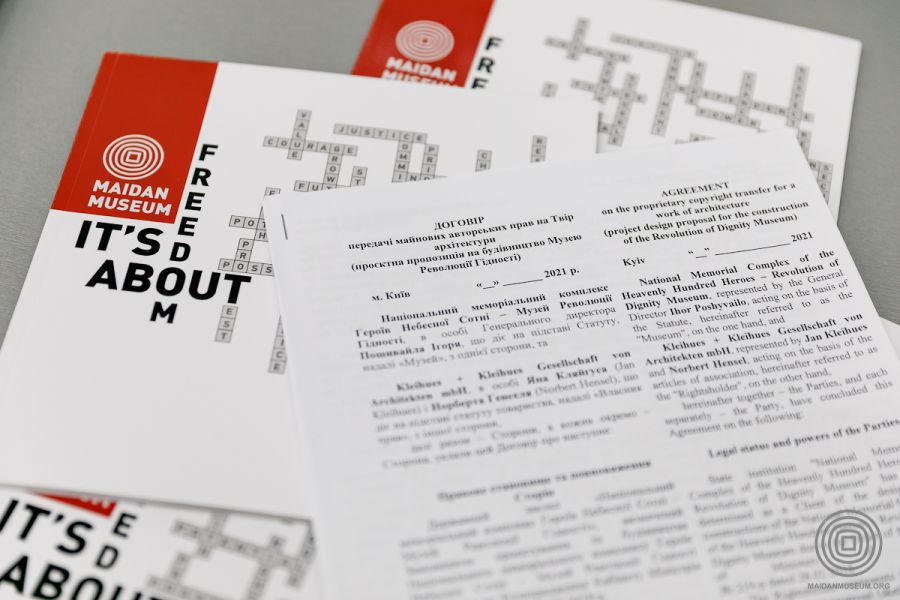 Переможець архітектурного конкурсу на проєкт Музею Революції Гідності визначений у жовтні 2018 року. Проте, українське законодавство — відкрите для участі іноземних суб'єктів в архітектурних конкурсах, та водночас недосконале в питаннях їхньої подальшої участі в роботі над цими проєктами. Зокрема, обов'язковою є участь у складі таких нерезидентів головного архітектора та головного інженера проєкту, сертифікованих в Україні. Це в свою чергу вимагає від нерезидентів відкривати представництва в Україні, що для поодиноких проєктів є недоцільним. Залучення ж нерезидентами до співпраці українських архітектурних бюро не відповідає законодавству України з питань публічних закупівель у частині, зокрема, переговорної процедури укладення договорів із переможцями архітектурних конкурсів. Це, серед іншого, стало причиною довготривалого пошуку шляхів для початку проєктування та будівництва Музею Революції Гідності. Досягнення згоди про безоплатну передачу Музею прав інтелектуальної власності на проєкт Музею Революції Гідності дозволяє розпочати роботу з відбору генерального проєктувальника та розробки проєктно-кошторисної документації, а згодом — братися за будівництво.