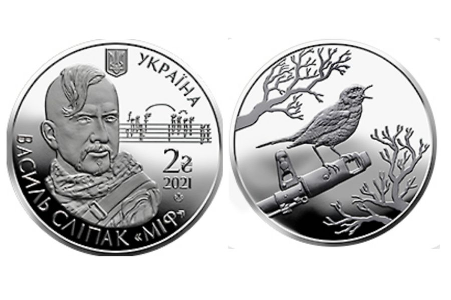 Пам'ятна монета "Василь Сліпак" присвячена Герою України, кавалеру ордена "За мужність" І ступеня, кавалеру ордена "Золота Зірка", волонтеру, воїну-добровольцю з позивним "Міф" Василю Ярославовичу Сліпаку. Він відомий український оперний співак, соліст Паризької опери, член Об'єднання українців Франції, який з 2014 року боронив українську державу від російського агресора і загинув 29 червня 2016 року від кулі снайпера поблизу смт Луганське.