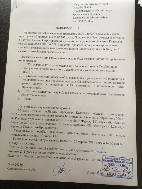 Для проведення слухань з обговорення суспільно важливих питань за ініціативою громади потрібно зібрати мінімум 150 підписів – їх є 156. Уповноваженою особою з проведення громадських слухань від ініціативної групи є депутатка Калуської міської ради Ольга Сікора, інформують "Вікна"