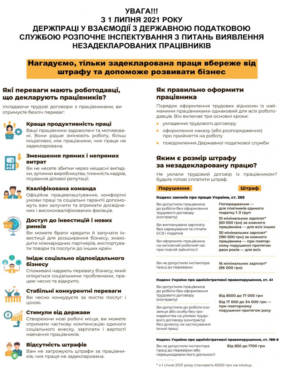В черговий раз звертаємо увагу роботодавців на недопущення використання незадекларованої праці. Якщо ви вважаєте, що використання незадекларованої праці спрощує ведення бізнесу та зменшує фінансові витрати, ви помиляєтеся. Фінансові ризики і наслідки використання незадекларованої праці значно перевищують витрати, які виникають у разі оформлення трудових відносин із працівниками відповідно до законодавства. Незадекларована праця наносить шкоду суспільству, державі та працівнику. Будьте свідомими громадянами, дотримуйтесь законодавства про працю.