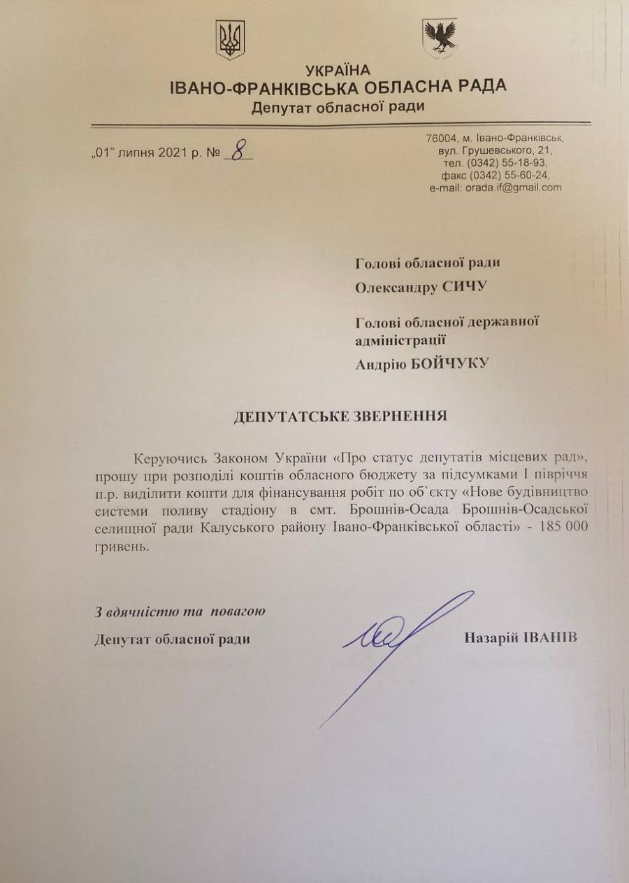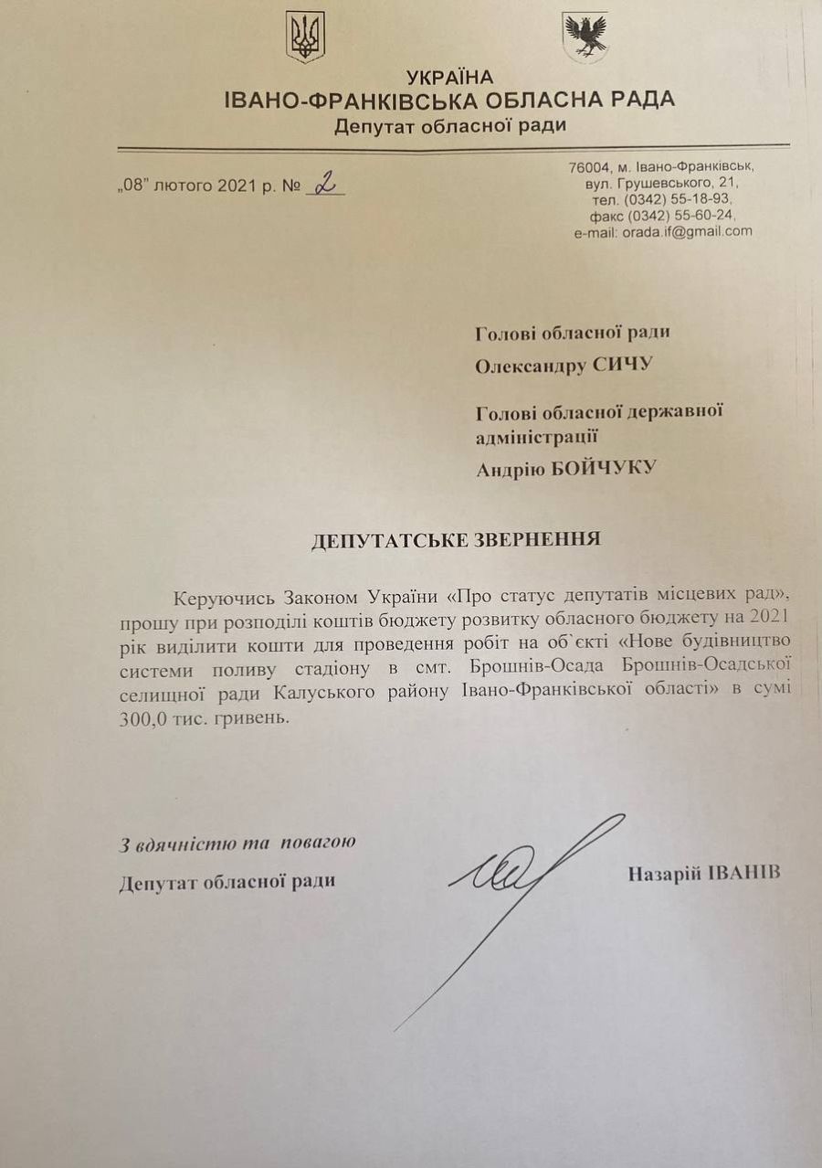 "За моїм зверненням як депутата обласної ради з обласного бюджету 19 лютого 2021 р. виділено 300 тис. грн на будівництво системи поливу на стадіоні Карпати у Брошнів-Осаді, а сьогодні, 9 липня, — ще додатково виділено 185 тис. грн. на реалізацію цього проєкту. Отож інформую жителів Брошнів-Осадської ТГ, що за кошти обласної ради розпочато і буде завершено облаштування системи поливу стадіону", — йдеться в повідомленні.