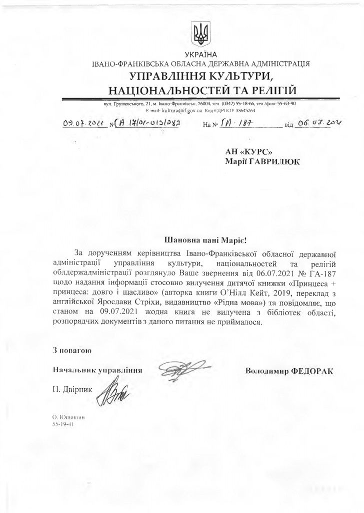 Нагадаємо, про вилучення книжок «Принцеса+принцеса: довго і щасливо» під час засідання депутатської комісії з питань культури у четвер, 1 липня, заявила заступниця начальника управління культури Івано-Франківської ОДА Мирослава Корнелюк.