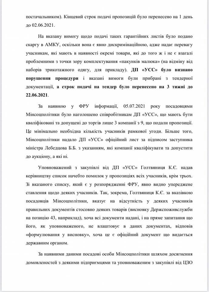 «За наявною у ФРУ інформацією, посадові особи Міністерства соціальної політики передали вказівку закупівельній організації — ДП «УСС» — кваліфікувати і допустити до торгів тільки 3 компанії з 9. Більш того, 05.07.2021 Мінсоцполітики надало ДП «УСС» офіційного листа за підписом заступників міністра із зазначенням, які компанії варто кваліфікувати, а які — ні», — про це йдеться у офіційному зверненні ФРУ до прем’єр міністра Дениса Шмигаля.