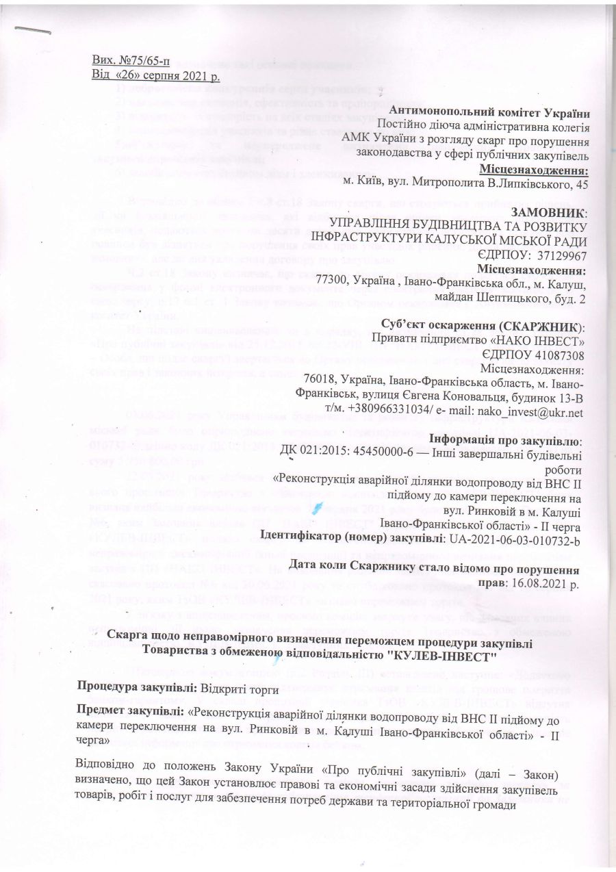 9 липня ТОВ «Кулев-інвест» подало скаргу не порушення процедури закупівлі та рішення замовника до Антимонопольного комітету України. 22 липня відбулося засідання колегії з оскарження публічних закупівель Антимонопольного комітету України, на якому розглянути скаргу ТОВ «Кулев-інвест». Колегія постановила: зобов’язати управління будівництва та розвитку інфраструктури Калуської міської ради скасувати рішення про відхилення тендерної пропозиції ТОВ «Кулев-інвест» та рішення про визначення ПП «НАКО ІНВЕСТ» переможцем за процедурою закупівлі.