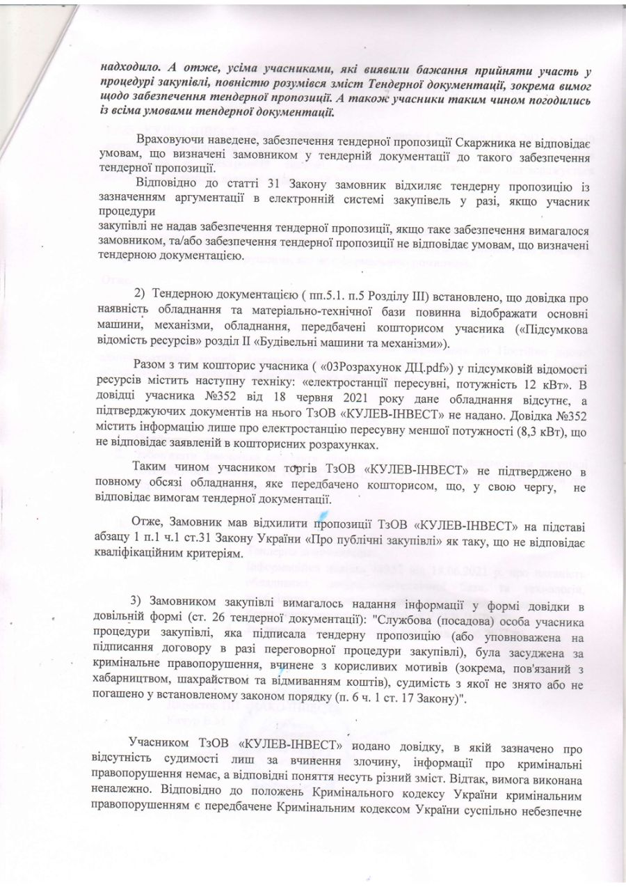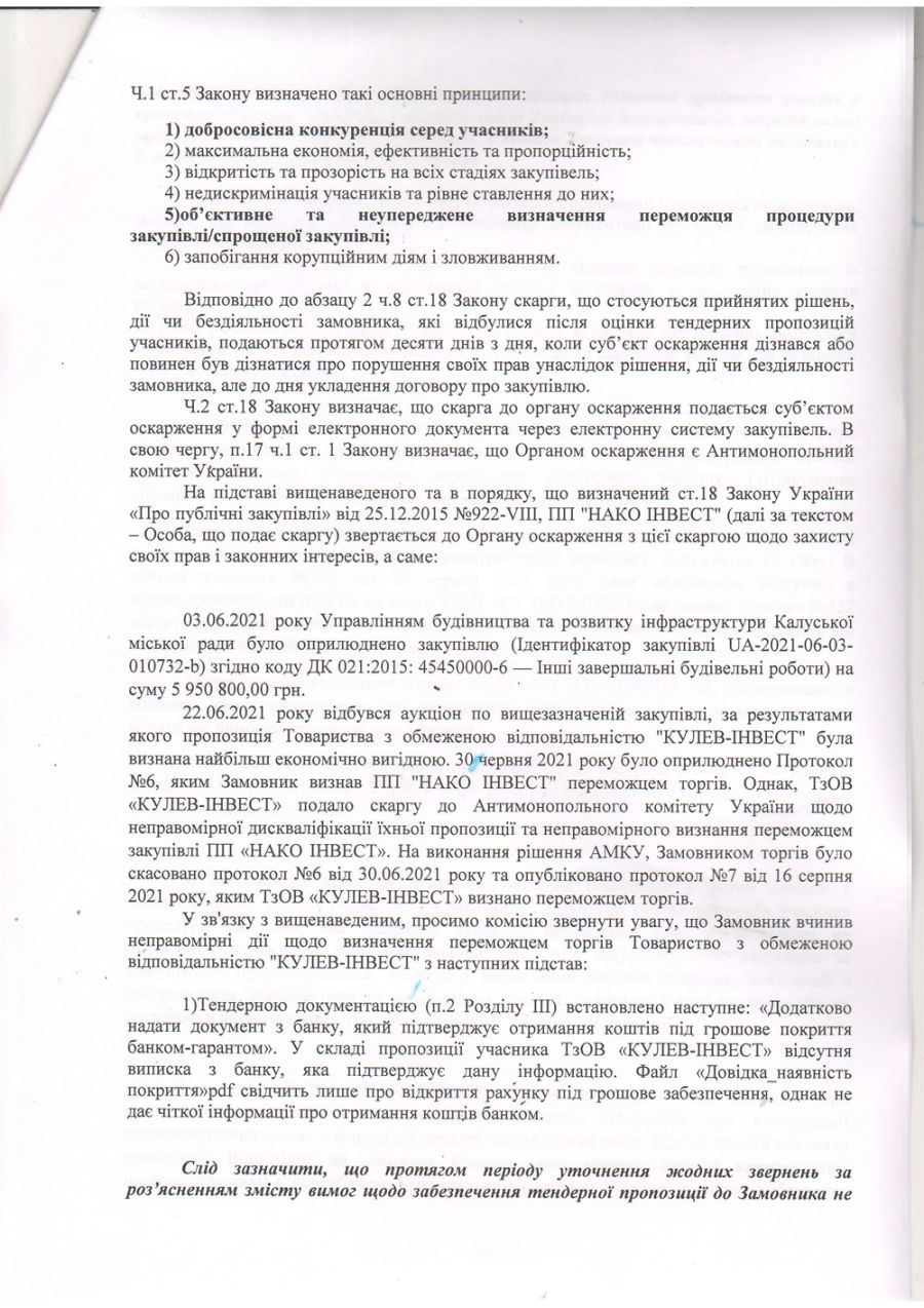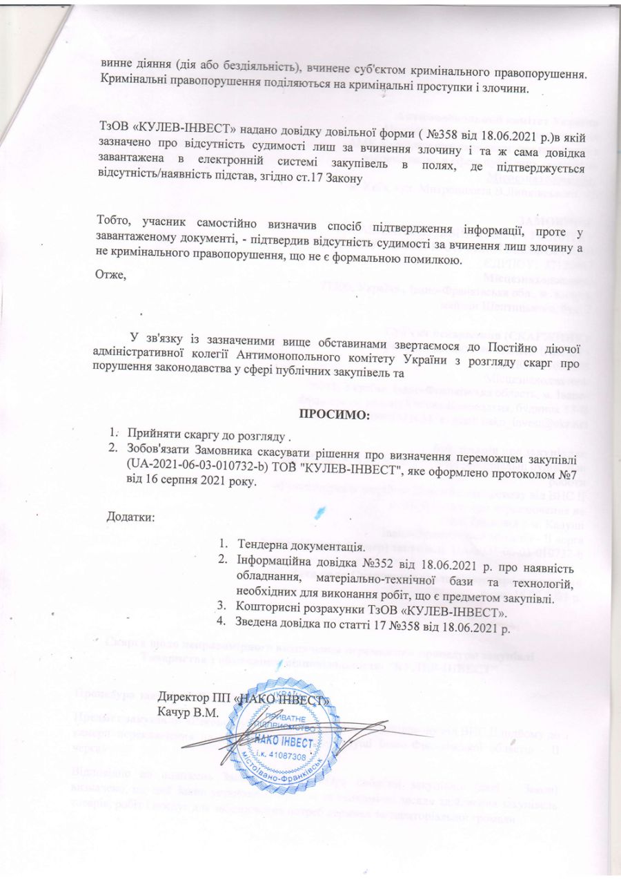 У скарзі йдеться про невідповідність тендерної документації ТОВ «Кулев-інвест» вимогам закупівлі (на думку ПП «НАКО ІНВЕСТ»). Зокрема, вказано на те, що учасник не подав довідку з банку, яка підтверджує отримання коштів під грошове покриття банком-гарантом, не підтверджено в повному обсязі обладнання, яке передбачене кошторисом та те, що учасник підтвердив лише відсутність судимості за вчинення злочину, а не кримінального правопорушення.