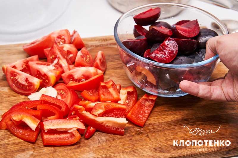 Помийте 1 кг слив та очистіть від кісточок, наріжте довільними шматочками. Томати (2 шт.), один солодкий перець та один чилі теж довільно наріжте.
